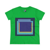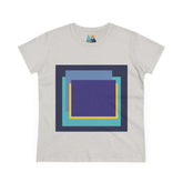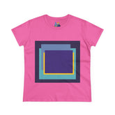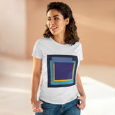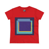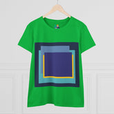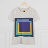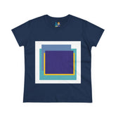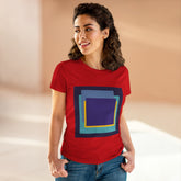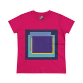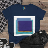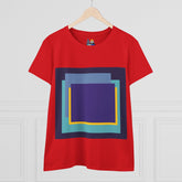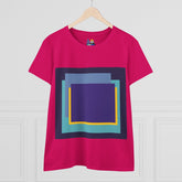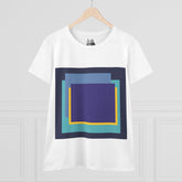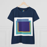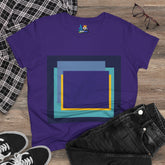 Bring structure and edge to your wardrobe with the My Life in Purple Squares Cubed Contemporary Art Design Women's Tee. This standout piece features layered geometric squares in bold shades of purple, teal, blue, and yellow—perfect for the art lover who sees life in layers. The modern graphic sits against a crisp white background (also available in 8 striking colors), turning any outfit into a canvas of cool.