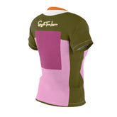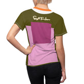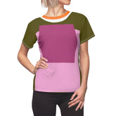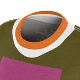 Introducing a stylish tee, perfect for those who appreciate unique designs and comfort. The Pink Squared Geometric Print tee showcases a bold blend of olive green, bubblegum pink, and deep magenta in a playful geometric layout, elevated by a striking white and orange ribbed collar. Both the front and back feature color-blocked square patterns, with the back also displaying the SingleTree Lane logo for added flair.