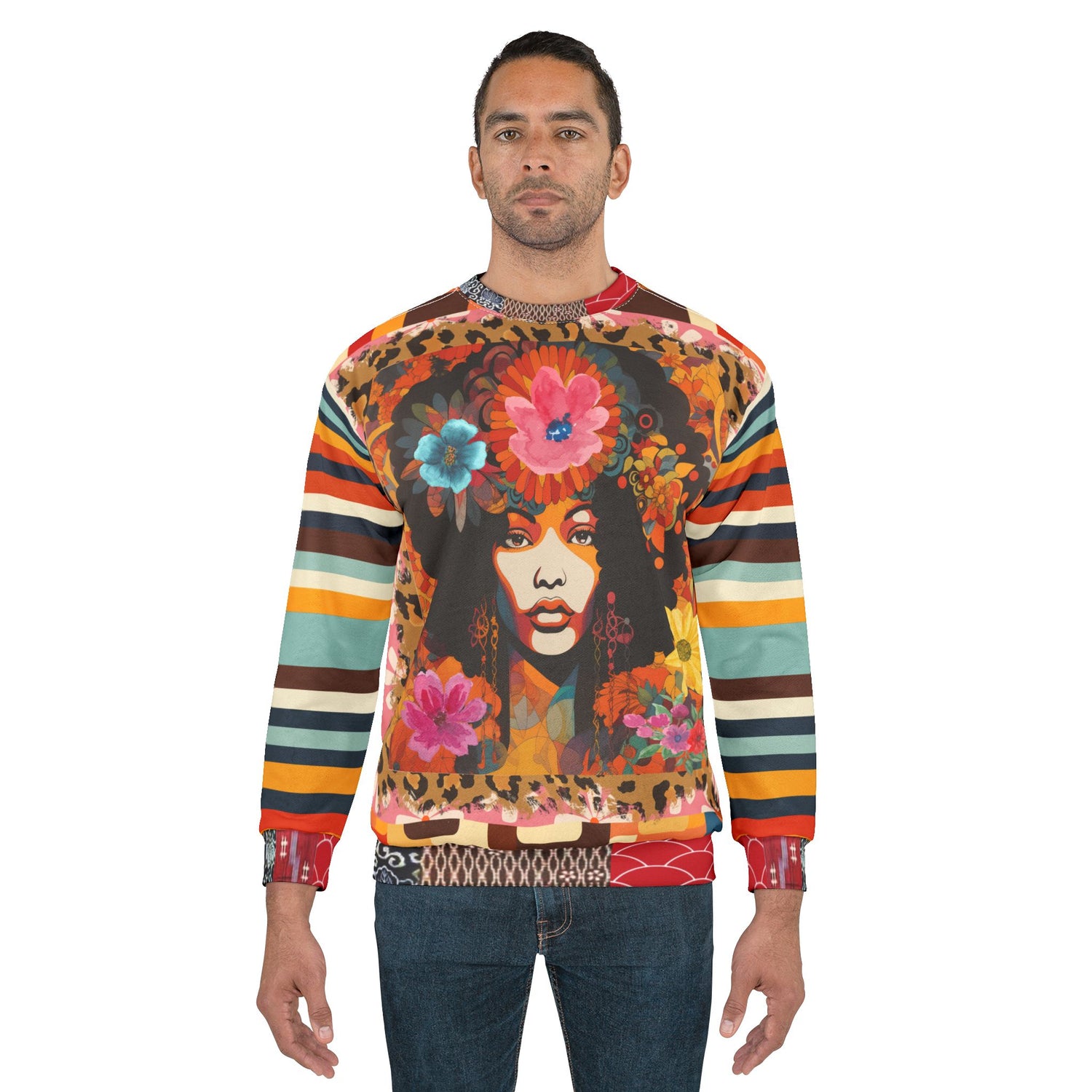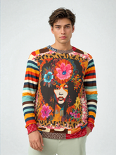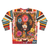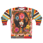 Embrace the essence of vintage soul with the '1970s Natural Woman' Unisex Sweatshirt. A tribute to the bold beauty of the disco era, this statement piece features a striking portrait of a natural-haired goddess adorned with vibrant florals, embodying the power and grace of Black femininity.