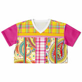 Bring bold energy to your wardrobe with the Ashbury Heights Paisley Eco-Poly V-neck Crop Jersey, a lively fusion of 70s flair and modern-day confidence. This cropped jersey is bursting with personality—featuring a kaleidoscopic mix of paisley swirls, cheerful florals, and preppy plaid panels in punchy hues of hot pink, lemon yellow, turquoise, and coral. The eye-catching patchwork design celebrates individuality and the art of joyful dressing.