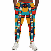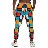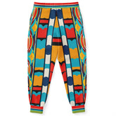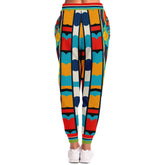 The multicolor geometric stripe pattern—featuring rich reds, turquoise blues, sunflower yellows, and playful button motifs—represents the city’s dynamic skyline, art scene, and unstoppable energy. Crafted from breathable midweight eco-poly athletic wear fabric, these joggers are built for comfort, durability, and standout style. With an elastic drawstring waistband and hidden side seam pockets, they're perfect for travel, leisure, or turning heads downtown.