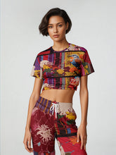 Step into a world where nature and abstract design harmonize beautifully. This cropped pullover bursts with life, featuring an intricate fusion of painterly florals, bold striping, and layered textures that echo the spirit of wearable art. At its heart, a strikingly detailed songbird sits gracefully among blossoms, symbolizing freedom, individuality, and delicate strength. The floral motifs range from soft magnolia-inspired whites to radiant reds, yellows, and oranges, balanced by a bold backdrop of crimson, indigo, mustard, and earthy neutrals, creating a dynamic palette that is both eye-catching and timeless.
