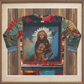 Vivid patchwork sleeves feature tribal patterns, symbolic artifacts, and rustic button designs, offering texture and depth against a striking southwestern motif. The palette blends turquoise, crimson, copper, and desert hues, bringing warmth and history together in one unforgettable garment.