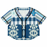 Elevate your wardrobe with the Blue Agadir Floral Stripe Cropped Button Front Jersey, a bold mosaic of patterns inspired by Moroccan tilework and coastal flair. This eye-catching top features a mix of wide blue checkers, ornate baroque florals, and multicolored stripes on the sleeves, all trimmed with sleek black piping for a polished finish. The button-front design and V-neckline bring a sporty yet refined edge, while the cropped silhouette makes it perfect for high-waisted pairings.
