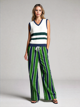 Channel the poise and prestige of Centre Court with the Wimbledon White and Green Knitted Cotton V-neck Vest. Crafted in soft, breathable cotton, this vest features a clean white base punctuated by elegant forest green stripes, embodying the understated sophistication of the Wimbledon tradition. The deep V-neckline, armholes, and hem are finished with navy ribbed trim, offering a crisp, tailored contrast.