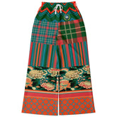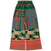 Embrace a fusion of classic elegance and bold modernity with the 'Zen Blossom Chrysanthemum' Plaid Stripe Eco-Poly Wide Leg Pants. These striking pants blend rich, contrasting patterns in traditional plaid and stripes interwoven with an opulent floral print featuring golden-hued chrysanthemums. The deep emerald green, burnt orange, and crimson palette evokes a sense of regal sophistication, while the elastic drawstring waist ensures comfort and a flexible fit.