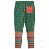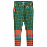 Elevate your athleisure game with the 'Zen Blossom Chrysanthemum' Plaid Eco-Poly Track Pants are a perfect fusion of classic plaid, vibrant patterns, and sustainable craftsmanship. These eco-friendly track pants feature a striking green and blue plaid base, accented by bold geometric and stripe patterns in warm orange and coral hues. A subtle embroidered crest adds a refined touch, making them the ultimate statement piece for those who appreciate both style and sustainability.