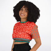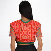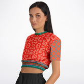 The cropped silhouette with an elastic hem offers a modern fit, making it ideal for layering or pairing with high-waisted pieces. A must-have for those who love to mix patterns and embrace vibrant, artistic style.