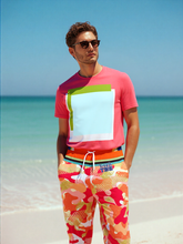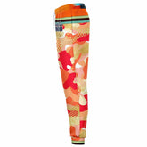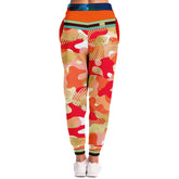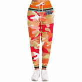 Turn up the heat in bold style with the Orange Crescent Camo Eco-Poly Unisex Joggers. These eye-catching joggers bring the fire with an electrifying blend of orange, red, coral, and peach in a crescent-style camouflage print. Gold lattice accents and abstract overlays add dimension and sparkle, while the striped waistband and cuffs give a sporty, retro vibe.