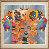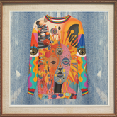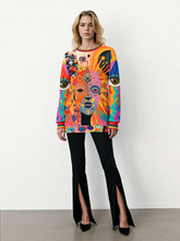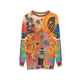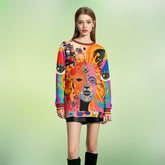 Perfect for those who appreciate avant-garde artistry and psychedelic aesthetics, this sweatshirt showcases a dazzling array of celestial motifs and vivid hues. The central figure, with her serene expression and radiant presence, embodies the power and mystery of the universe.