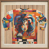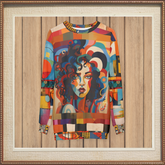 This captivating piece features a stunning light-skinned Black or Hispanic woman with loose, curly hair, brought to life in a vibrant array of abstract artistry. The rich, dynamic colors and patterns create an eye-catching design that's perfect for those who embrace bold, artistic fashion.