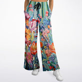 Immerse yourself in lush color with the Swan in Floral Isolation Stripe Eco-Poly Wide Leg Pants, a garden-dream print of vivid blooms and painterly botanicals layered over refreshing aqua-mint stripes—designed to coordinate with the collection’s swan-themed sweatshirt. This trippy, modern-garden fantasy moves beautifully and feels equal parts romantic and rebellious, turning every step into an expressive moment.