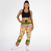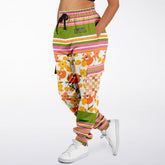 Bring playful retro vibes into your everyday with the Hopscotch My Hippie Gingham Floral Eco-Poly Cargo Joggers, where bold gingham stripes meet painterly floral prints in a carefree collage of color. Shades of lime green, fuchsia, golden yellow, and bright orange dance across the fabric, creating a lively patchwork that feels both nostalgic and fresh. The wide horizontal striping at the waist and ankles anchors the look, while cargo pocket panels introduce a cheeky gingham check that ties the design together. Finished with an embroidered STL monogram, these joggers are pure wearable art with a joyful hippie twist.