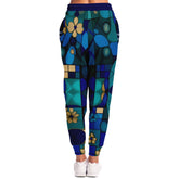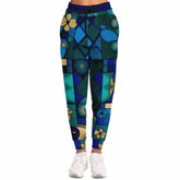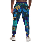 Step into an enchanting world of color and design with the Blue Mystic Plaid Eco-Poly Unisex Joggers. This captivating piece features a mosaic of deep blues, rich teals, and gold accents woven into a geometric plaid pattern, overlaid with delicate floral motifs. The overall effect is reminiscent of stained glass windows and mystical tilework, perfect for those who appreciate bold, artistic expression.