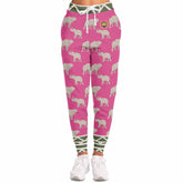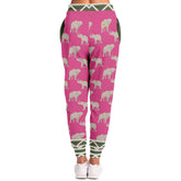 Stand tall and stride with pride in the 'Elephants on Parade in Pink' Eco-Poly Unisex Joggers. Set against a vibrant pink background, this playful design features a procession of stately gray elephants marching across the fabric in joyful repetition. The bold geometric trim in olive green and cream at the waistband and cuffs adds a stylish contrast, blending modern flair with a touch of the wild.