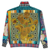 Inspired by Van Gogh’s iconic sunflower study from 1888, the Sunflowers in My 1888 Van Gogh Heavyweight Oversized Quarter Zip Sweatshirt transforms fine art into expressive, wearable form. A richly detailed sunflower still life dominates the front and back, rendered in warm golden yellows, ochre, and earthy browns, set against a teal and turquoise patterned backdrop that adds depth and visual movement. Vertical bands of muted mustard, rust, cream, and blue frame the artwork, creating a gallery-like composition.