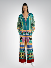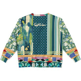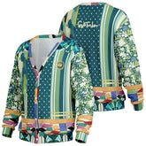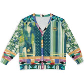 The Interior Salon with Forget-Me-Nots Heavyweight Unisex Cardigan transforms the essence of an art-filled parlor into a stunning statement piece. A lush composition of painterly florals, modern stripes, and soft polka dots invites the eye to wander like a stroll through a museum gallery. Each panel feels hand-curated: the hydrangea-patterned sleeves mirror vintage wallpaper elegance, while the geometric stained-glass motifs along the hem add a vivid, architectural rhythm. A contrast pink placket and crisp white buttons lend a tailored finish, and the chest crest embroidery offers a touch of refinement—like a signature mark on a masterpiece.