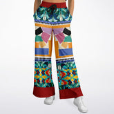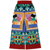 The Interior Salon with Forget-Me-Nots in Full Glory Eco-Poly Wide Leg Pants are a visual celebration of color, geometry, and artistic spirit. Drawing inspiration from early modernist interiors and bold stained-glass compositions, these pants feature a mesmerizing interplay of shapes and hues. Blocks of crimson, mustard, teal, and violet are framed by black-and-white gingham bands, leading into a cascade of jewel-toned Art Deco motifs along the hem. The deep red waistband and border anchor the vivid palette, creating balance and sophistication in every detail. Each leg becomes a canvas of abstract energy and painterly rhythm—alive with motion and intent.