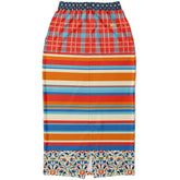 Infuse your wardrobe with vibrant Andalusian charm in the Meet Me in Andalusia Eco-Poly Long Pocket Skirt. This bold maxi-length skirt blends striking patterns into one wearable work of art: a red plaid upper panel, colorful orange and blue stripes through the body, and a delicate floral border at the hem. The contrast creates a tripping mix of rustic warmth and festive Mediterranean energy, making it a true statement piece.
