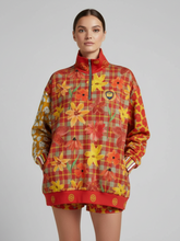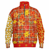 Wrap yourself in a bold mix of tradition and bloom with the Imperial Blossom in Peonies Heavyweight Oversized Quarter Zip Sweatshirt. This statement piece layers vivid watercolor-inspired peonies over a red tartan base, merging the elegance of florals with the structure of classic plaid. The sleeves tell their own story—contrasting panels of mustard with delicate white blossoms on one side and fiery red florals on the other—while striped cuffs add a playful edge. Finished with a deep red collar and hem decorated in symbolic motifs, this top embodies the perfect balance of heritage and modern flair.