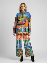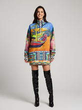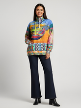 Constructed from a heavyweight poly-spandex blend for both structure and softness, this quarter zip offers durability with a plush fleece interior that keeps you warm without compromising breathability. The high collar, half-zip front, and oversized fit ensure both comfort and effortless style, while the ribbed cuffs and hem create a polished silhouette. Whether layered over jeans for a relaxed coastal vibe or styled with statement trousers for a gallery-ready look, this piece captures the spirit of art, travel, and individuality—one that echoes the rhythm of the sea and the joy of creative freedom.