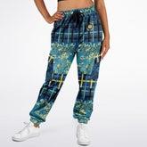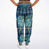 Bold pattern play and painterly texture come together in Flowers in Blue Vase – Van Gogh Eco-Poly Cargo Joggers, transforming a classic Van Gogh still life into functional, wearable art. Rich teal and sapphire blues set the foundation, layered with soft cream blossoms, inky navy undertones, and structured plaid accents punctuated by golden yellow striping for contrast and rhythm.