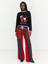The back showcases the Singletree Lane name knitted in graceful script, offering a chic branded detail. Designed with a flattering boatneck and crisp white trim at the neckline, cuffs, and hem, it brings timeless 50s-inspired charm to any outfit.