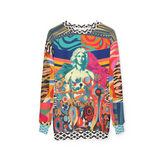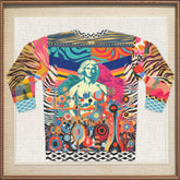 Angel on a Rampage Pop Art Unisex Sweatshirt unleashes celestial energy with a rebellious twist, featuring a striking angelic figure at the center of a swirling, tripping explosion of bold color, retro-mod circles, neon waves, abstract florals, and unexpected animal-print accents. The vibrant patchwork of oranges, blues, pinks, and teal creates a dynamic, otherworldly visual story that feels both fantastical and fiercely modern, framed with graphic black-and-white borders for a polished pop-art finish.