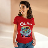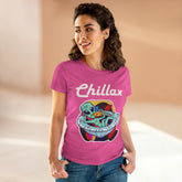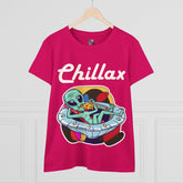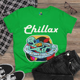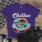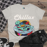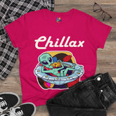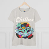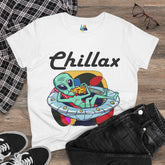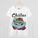 Chillax and Chill Alien Style Tee print featuring an alien eating a slice of pizza while laying back in his space craft. Definition of Relax and Chill with some humor. This fun and relaxed tee is perfect for anyone looking to unwind and embrace their inner chill. Ideal for casual occasions and lounging around the house. Great for those who love aliens, pizza, and a good laugh. Perfect for summer BBQs, movie nights, and lazy Sundays.