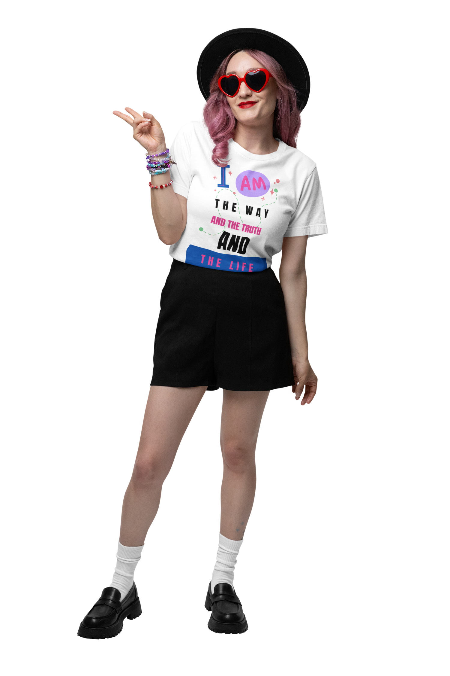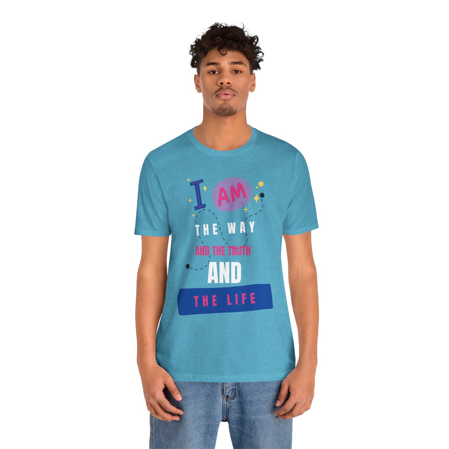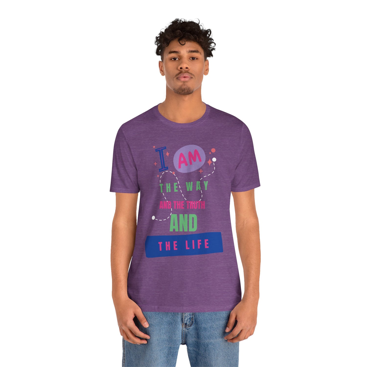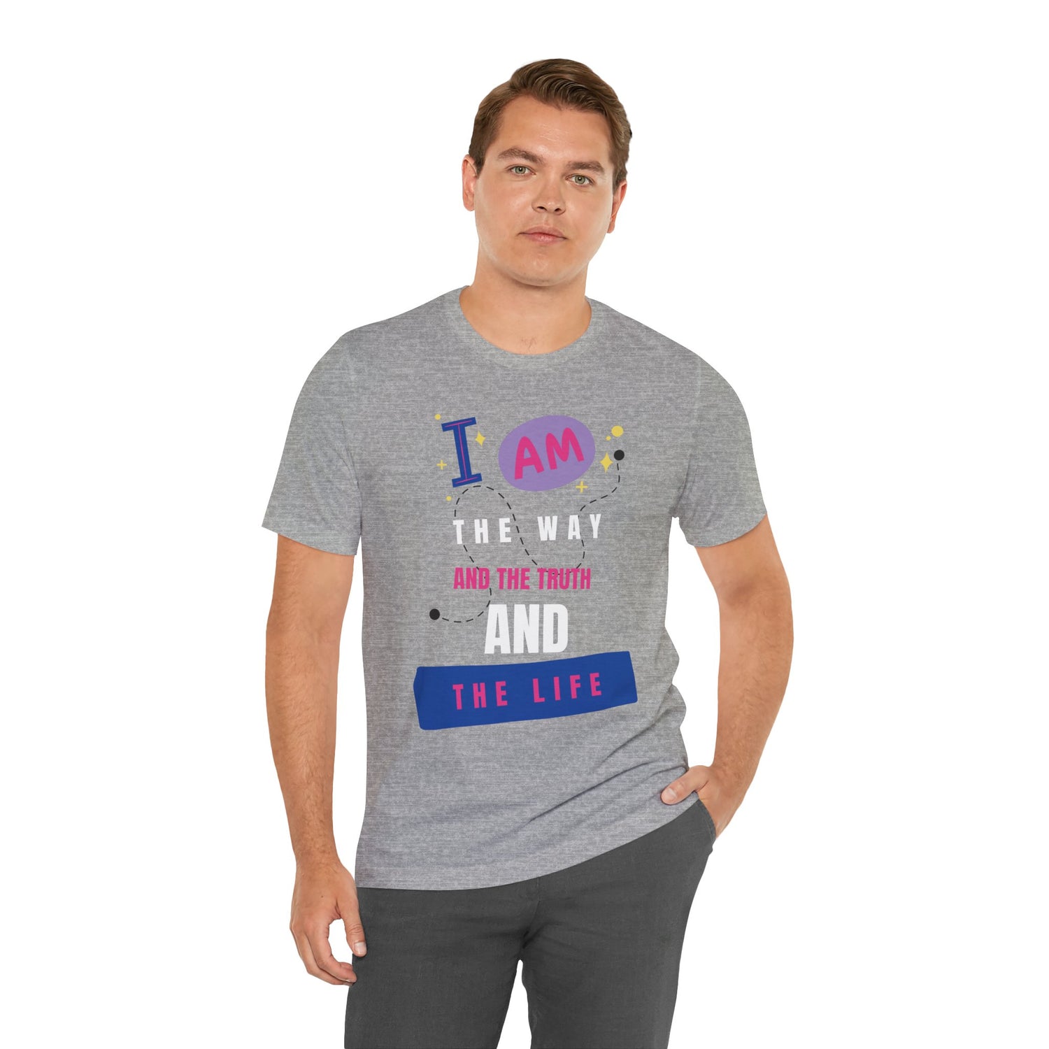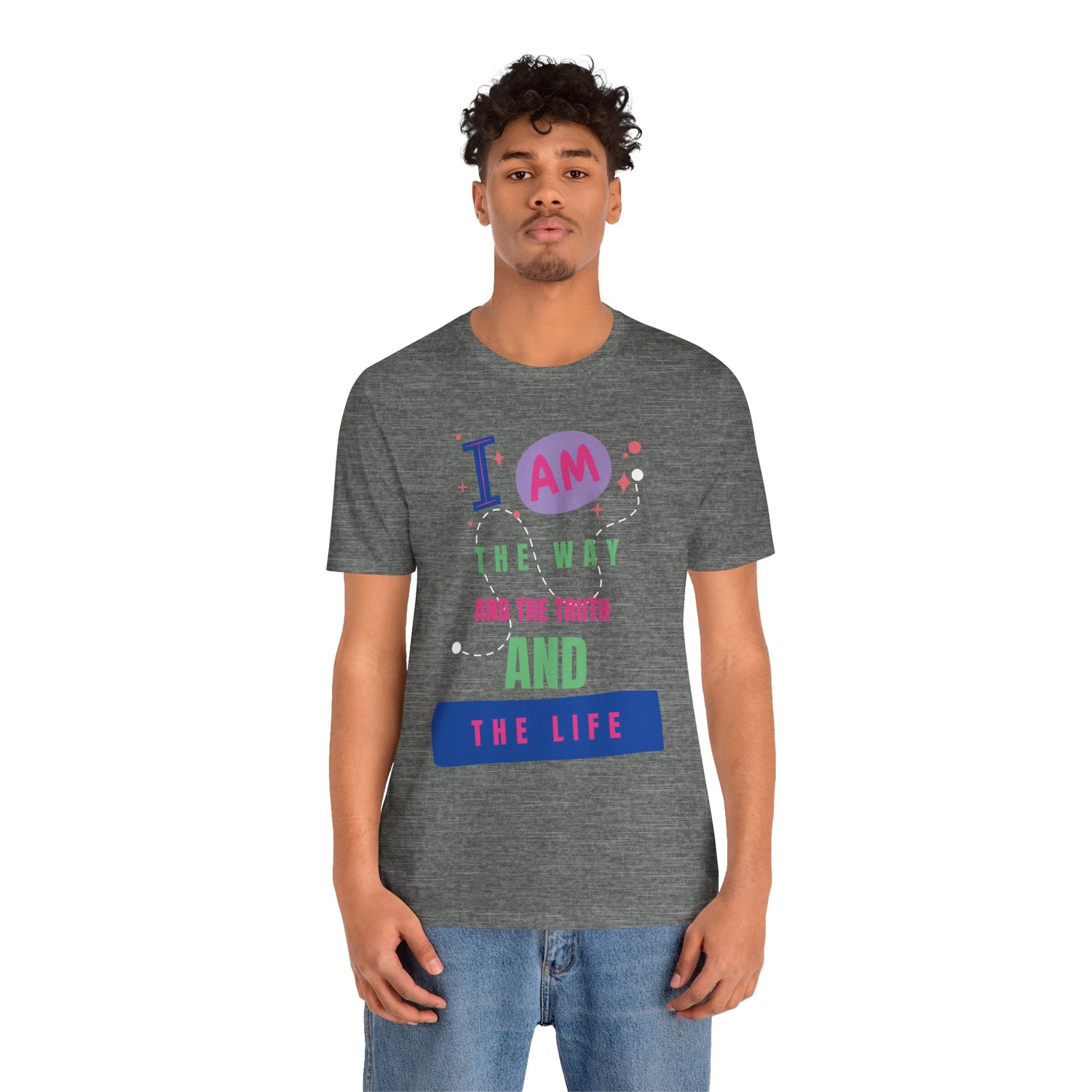 Step into faith and style with the 'I AM the Way' unisex tee, featuring a vibrant and eye-catching design. This tee showcases a bold, modern graphic with the powerful message: 'I am the way and the truth and the life,' as said by Jesus. The playful typography and colorful elements, including striking pinks, blues, greens, and whites, make this shirt a standout piece. Available in 13 different colors, including solids and heathered fabrics, this tee is perfect for expressing your beliefs while staying fashion-forward. Whether you're dressing it up or keeping it casual, this tee is a versatile addition to any wardrobe. Grab yours now and make a statement that resonates with both your faith and your style.