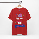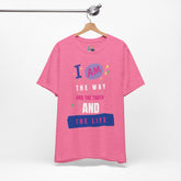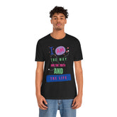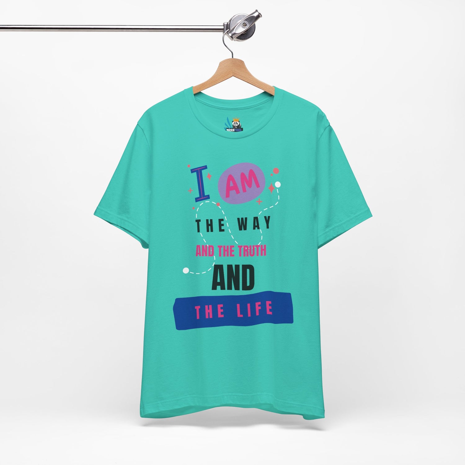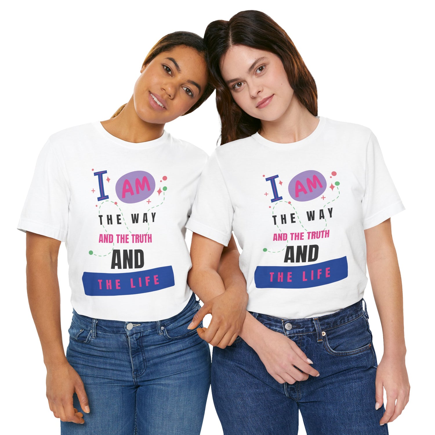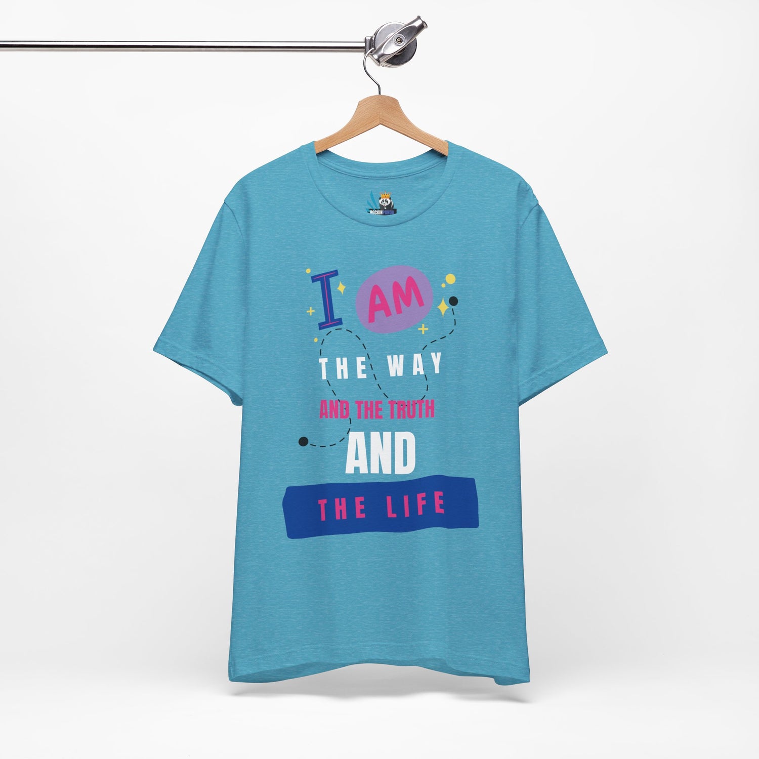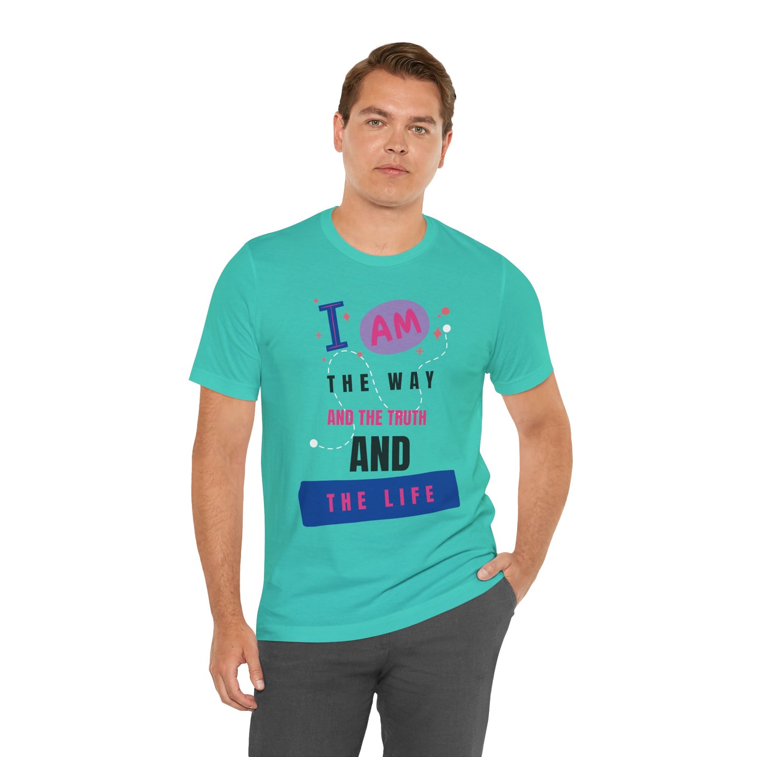Step into faith and style with the 'I AM the Way' unisex tee, featuring a vibrant and eye-catching design. This tee showcases a bold, modern graphic with the powerful message: 'I am the way and the truth and the life,' as said by Jesus. The playful typography and colorful elements, including striking pinks, blues, greens, and whites, make this shirt a standout piece. Available in 13 different colors, including solids and heathered fabrics, this tee is perfect for expressing your beliefs while staying fashion-forward. Whether you're dressing it up or keeping it casual, this tee is a versatile addition to any wardrobe. Grab yours now and make a statement that resonates with both your faith and your style.