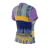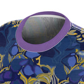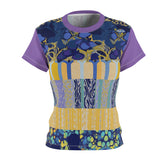Step into your power with the Mass Hypnosis Abstract Floral AOP Women’s Tee, a stunning fusion of eclectic patterns and hypnotic color play. This fitted tee is a masterclass in wearable art—layering bold floral imagery in rich indigos and violets with geometric striping, golden botanical motifs, and wave-like forms that flow effortlessly from top to hem. A harmonious patchwork of vertical and horizontal designs creates an almost rhythmic energy, as if the patterns are pulsing with intention. Framed by soft lavender sleeves and a matching ribbed collar, the look is elevated by contrast stitching and expert construction for a finish that’s polished yet playful.