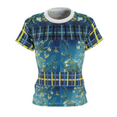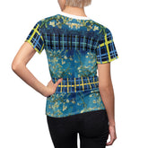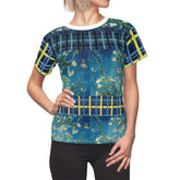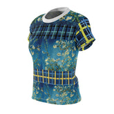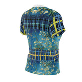 Bold color, painterly movement, and graphic structure come together in Flowers in Blue Vase – Van Gogh AOP Women’s Tee, transforming a beloved still life into an expressive, everyday statement piece. The central panels draw from Van Gogh’s Flowers in a Blue Vase (1887), where branching blossoms float across layered blues, creating depth, motion, and a sense of living brushwork. These organic forms are framed by contrasting plaid bands and geometric accents in navy, teal, and golden yellow, adding rhythm and modern structure to the composition.