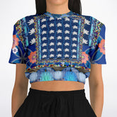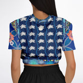 Embrace nature's harmony with the Dahlia Lama Lotus Flower Print Eco-Poly Short Sleeve Cropped Pullover. This vibrant design features a mesmerizing patchwork of white lotus blossoms framed by geometric motifs and coral dahlias, all set against a tranquil blue palette with hints of green and lavender. The result is a wearable work of art that blends peaceful energy with bold visual flair.
