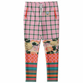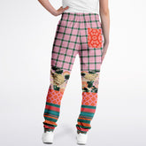 Bring serenity and style to your everyday with the Pink Zen Blossom Chrysanthemum Unisex Eco-Poly Track Pants, a harmonious fusion of playful pattern and tranquil floral art. The upper features a soft pink-and-green plaid accented with a subtle crest emblem, blending preppy charm with sporty appeal. Below the knees, the design blooms into a stunning chrysanthemum garden in rich ivory, blush, and green tones, framed by coral quatrefoil and multicolor striped panels for an eclectic yet balanced vibe.