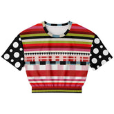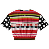 Playful and polished, the Life in Matchbook Plaid and Stripes Eco-Poly Short Sleeve Cropped Pullover turns every day into an art exhibit of color and contrast. Bands of red, pink, and olive stripes line up beside checkered motifs and graphic blocks, creating a rhythm that feels both modernist and nostalgic. The black-and-white polka-dot sleeves frame the piece in bold contrast, while the elasticized hem gives a flattering, easy-to-style shape that works with high-waisted pants or layered looks.