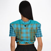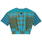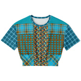 Bring a splash of paradise to your wardrobe with the Maldives in the Background Plaid Geometric Eco-Poly Short Sleeve Cropped Pullover. This bold cropped top features a fusion of golden plaid, blue tartan, and abstract geometric patterns, anchored by a mesmerizing seashell-inspired vertical print down the center. The playful mix of textures and motifs is a visual celebration, making it a standout piece for bold, confident styling.