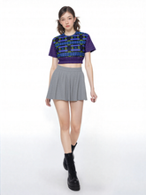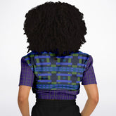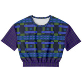 Bring bold geometry into your wardrobe with the Navy and Green Square Olympia Plaid Eco-Poly Short Sleeve Cropped Pullover. Featuring an eye-catching square plaid pattern in navy, green, and hints of cobalt blue, this cropped pullover strikes a perfect balance between sporty and artistic. The front and back showcase a dynamic grid of layered squares and rectangles, while the sleeves and elastic hemline are accented with a complementary fine-line grid pattern for added depth and contrast.