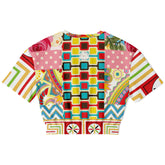 Step into surrealist style with the Pink Paisley Park Visage cropped pullover—a daring fusion of pop art whimsy and psychedelic flair. This bold top features a patchwork of retro paisleys, florals, zigzags, and graphic motifs, anchored by a mesmerizing eye peeking out from the upper right—adding a playful twist of intrigue. The colorful grid at the center forms the silhouette of a mysterious face, making this top both wearable art and a conversation starter.