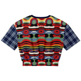 Channel the vivid beauty of a French Riviera evening with the Sunset in Cassis Abstract Rainbow Stripe Eco-Poly Short Sleeve Cropped Pullover, a striking statement piece that transforms everyday wear into an artistic celebration. This bold design is a feast for the eyes, blending multiple prints into a harmonious patchwork—fluid rainbow waves ripple alongside mesmerizing concentric circle motifs, bold geometric striping, and multicolored arcs that echo the glow of a seaside sunset. Navy-and-white plaid sleeves add an unexpected twist, grounding the kaleidoscope of colors with a classic touch.