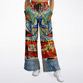 Immerse yourself in wearable art with the Red Oval on Gold and Denim Plate Eco-Poly Wide Leg Pants, a bold expression of color, culture, and geometry. The design fuses fiery red and gold backdrops with abstract blue and green brushwork inspired by graffiti art, balanced by serene blue-denim plate motifs. At the hem, contrasting black-and-white gingham panels frame the piece, adding a playful, modern edge. Scenes of painted café tables and vibrant bouquets infuse a whimsical, almost theatrical feel—like stepping into an artist’s studio mid-creation.
