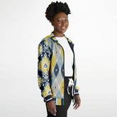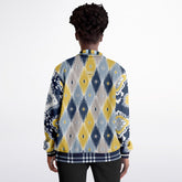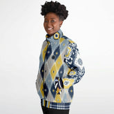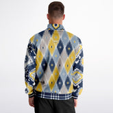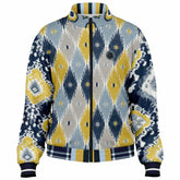 levate your athleisure style with the Royal Navy and Yellow Indian Batik Track Jacket. Featuring a stunning batik-inspired print in navy, yellow, and white, this jacket combines cultural artistry with modern versatility. The contrasting patterns on the sleeves and body create a striking visual balance, perfect for making a bold fashion statement.