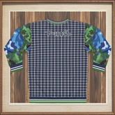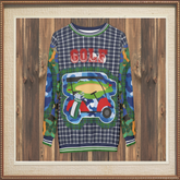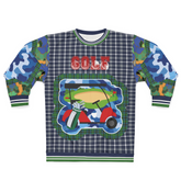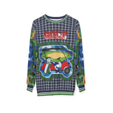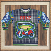 The design centers around a vibrant golf cart graphic, boldly outlined in a mix of blue and green hues, evoking the lush fairways and rolling landscapes of the game’s most iconic courses. Above it, the word 'GOLF' pops in varsity-style red lettering, giving a retro, collegiate feel. Surrounding this centerpiece is a dynamic fusion of classic tartan plaid in navy and green, creating a refined yet contemporary aesthetic. But the details don’t stop there—each sleeve is a masterpiece of contrast, featuring bold camouflage and blue abstract patchwork, adding a streetwear-inspired twist that takes this golf-ready look to the next level.