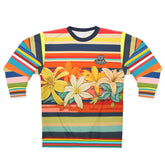 Embrace island vibes with the 'Retro Hawaiian Plumeria' Rugby Stripe Unisex Sweatshirt. This vibrant design features bold horizontal stripes in a nostalgic palette of navy, mustard yellow, burnt orange, teal, and coral, reminiscent of vintage surf culture. The standout centerpiece is a lush bouquet of plumeria flowers, symbolizing paradise, beauty, and the spirit of Aloha.