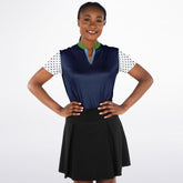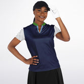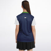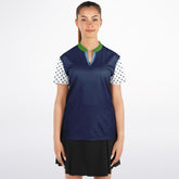 Serve classic style with a modern twist in the Sailor Blue Tennis Mandarin Collar Ladies Polo Jersey. Featuring a deep navy body, crisp white sleeves dotted with navy polka dots, and a striking green mandarin collar accented with a subtle sky-blue placket, this shirt brings sophistication and charm to the court. Crafted from a lightweight, moisture-wicking fabric, it offers superior breathability and keeps you dry during intense play. The tailored cut enhances movement while maintaining a polished silhouette, perfect for both competitive matches and post-game socials. A chic and functional choice that embodies timeless tennis elegance.