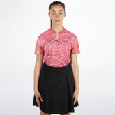 Bring a bold yet refined flair to the green with the Sunsets in Coral Gables Abstract Floral Mandarin Collar Ladies Polo Golf Shirt from Club Bedlam Sport. This eco-friendly golf shirt captivates with its striking coral base and abstract floral linework, accented by subtly patterned sleeves and a sleek mandarin collar with a modern V-notch neckline. Crafted from 100% recycled polyester, it combines sustainability with performance, offering exceptional moisture-wicking, breathability, and soft stretch comfort to keep you focused and stylish through every swing.