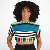 Break free from boring basics with the Everglades Jailhouse Stripe Eco-Poly Short Sleeve Cropped Pullover. This bold design is a riot of horizontal and vertical stripes in every direction—featuring black-and-white jailhouse lines intersected with a kaleidoscope of vibrant hues: teal, cherry red, moss green, sunny yellow, and sky blue. The cropped silhouette flatters with a relaxed fit, while the elastic hemline adds shape and streetwear edge.