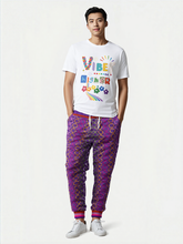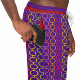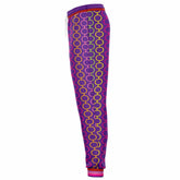 Turn up the volume on your wardrobe with the Rainbow Hippie Links Eco-Poly Unisex Joggers—a groovy throwback to 70s flair with a modern twist. These vibrant joggers feature a hypnotic chain-link pattern in bold rainbow hues—magenta, tangerine, lemon, lime, and violet—set against a rich purple backdrop. The playful colorblocking continues on the striped cuffs and waistband, adding a pop-art finish to this high-energy look.
