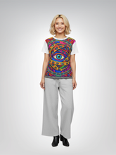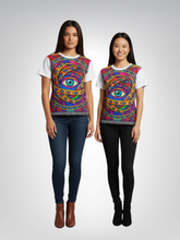 Designed as a wearable symbol of protection and awareness, My Friend the Ophanim – Angel Pop Art Women’s Tee features an all-over print inspired by the Ophanim—angelic beings described as wheels of light and eyes, representing divine perception, vigilance, and higher consciousness. A vivid central eye is wrapped in layered, orbiting forms filled with repeating eyes, surrounded by bold color blocking, wing-like elements, and graphic patterning that feels expressive, powerful, and otherworldly without being chaotic. The artwork comes alive in a rich palette of electric blues, golden yellows, fiery oranges, magenta pinks, deep purples, vivid greens, and graphic black-and-white detailing along the hem.