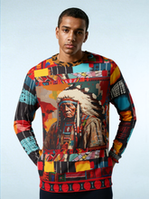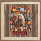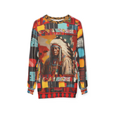 Honor the strength and wisdom of Native heritage with the 'Native Chief in Vibrant Colorblock' unisex sweatshirt. This statement piece combines the striking image of a noble Native chief with a captivating patchwork of colors and patterns, creating a modern yet respectful homage to indigenous culture. Each sleeve and panel showcases unique geometric shapes in vibrant hues of red, yellow, blue, and orange, enhancing the rich visual storytelling and artistry.